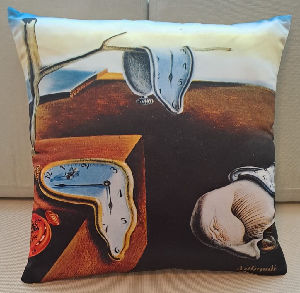 Cojíndecorativo con la obra “La persistencia de la memoria” de Salvador Dalí, quemuestra los icónicos relojes derretidos del surrealismo. Un…