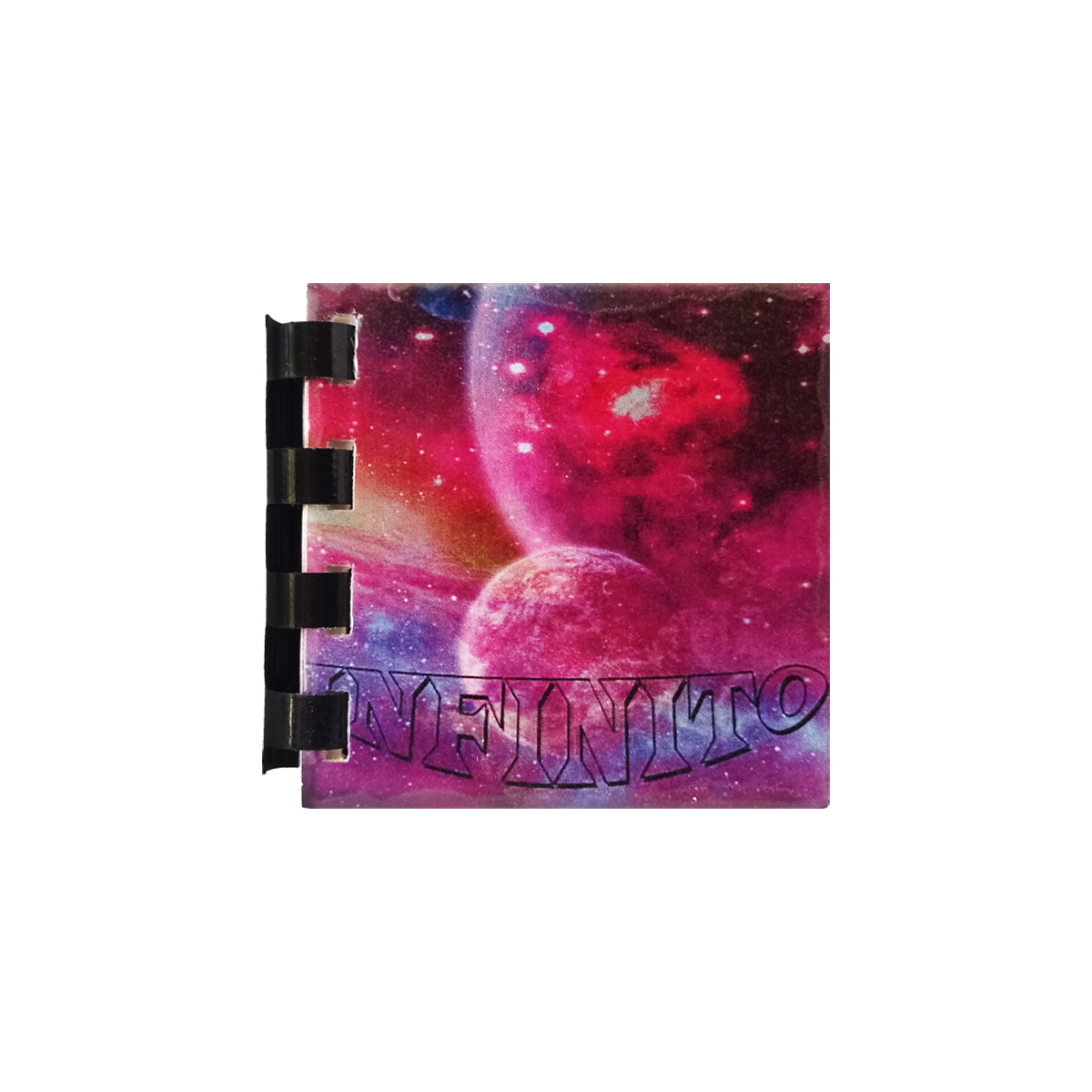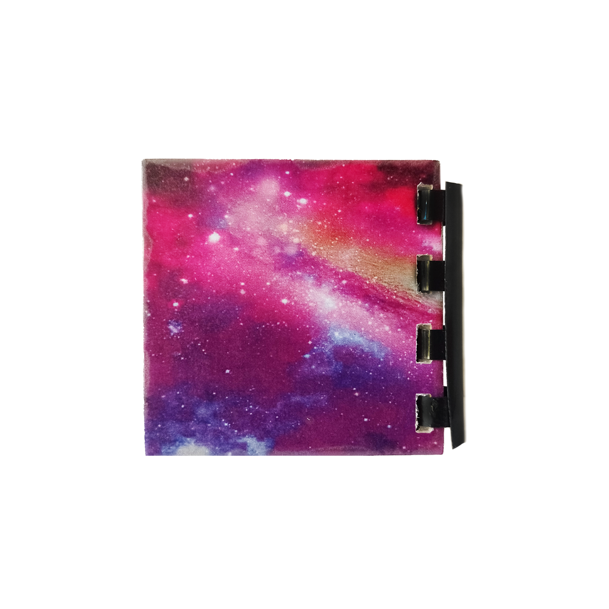 Mini agenda cuadrada artesanal con diseño de universo, práctica y única, hecha con materiales reciclados.