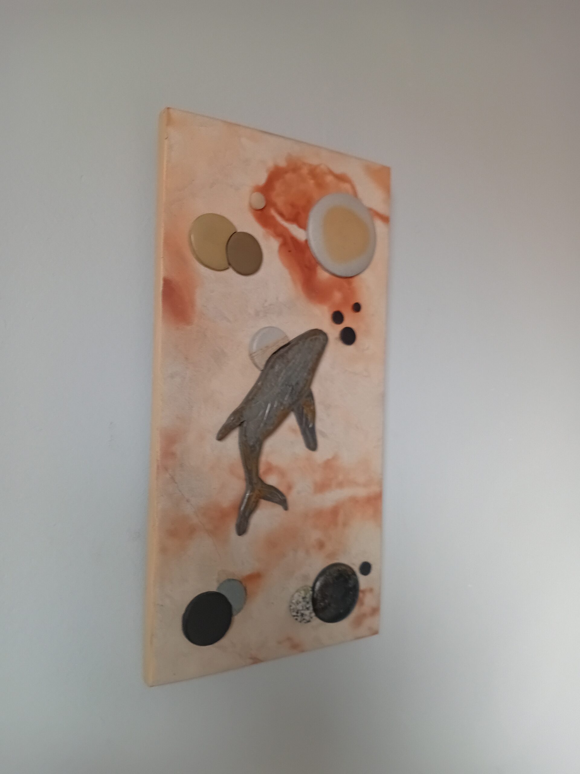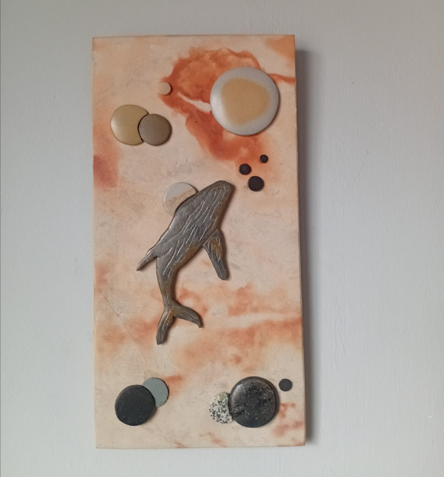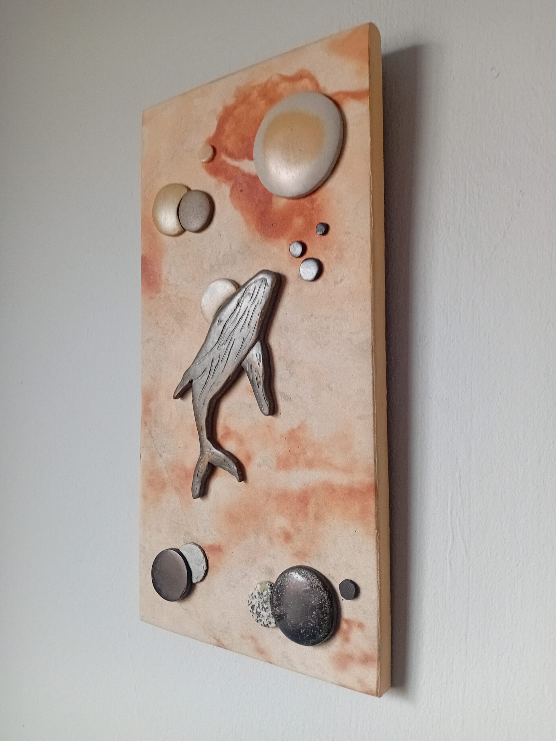 Relieve artesanal de ballena y planetas en piedra natural 100% hecho a mano.