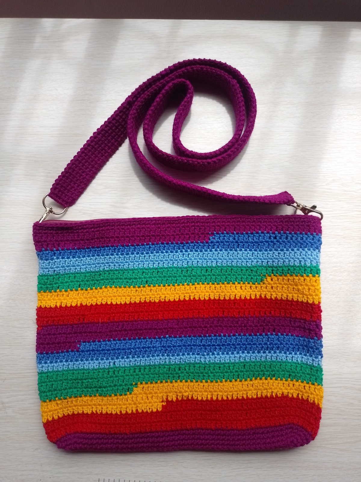 Bolso tejido en crochet con vivos colores rasta ideal para un look bohemio y casual.