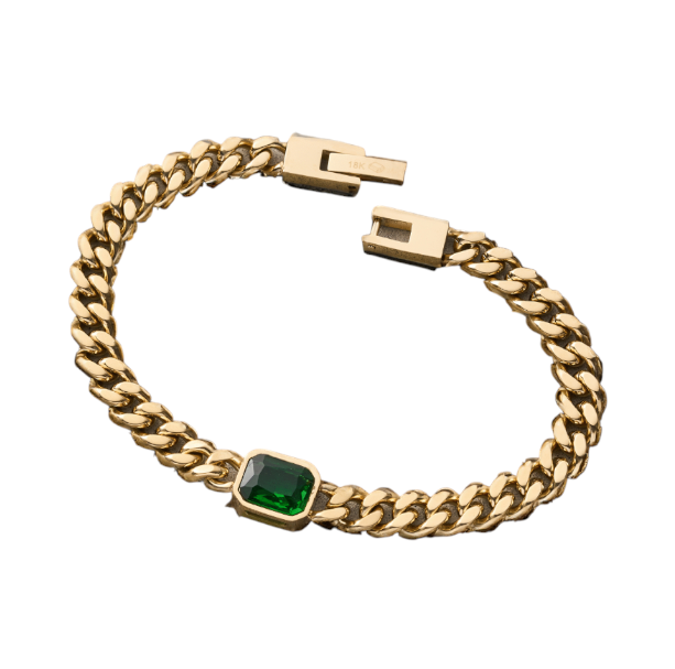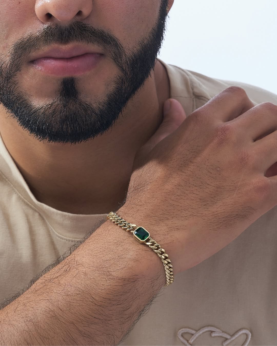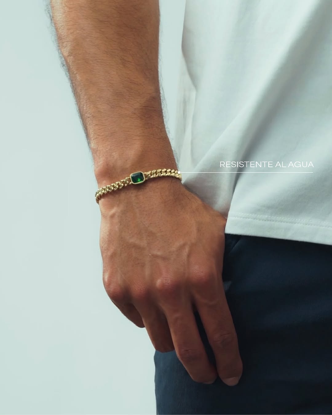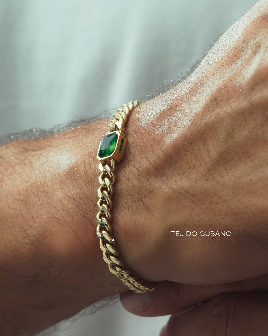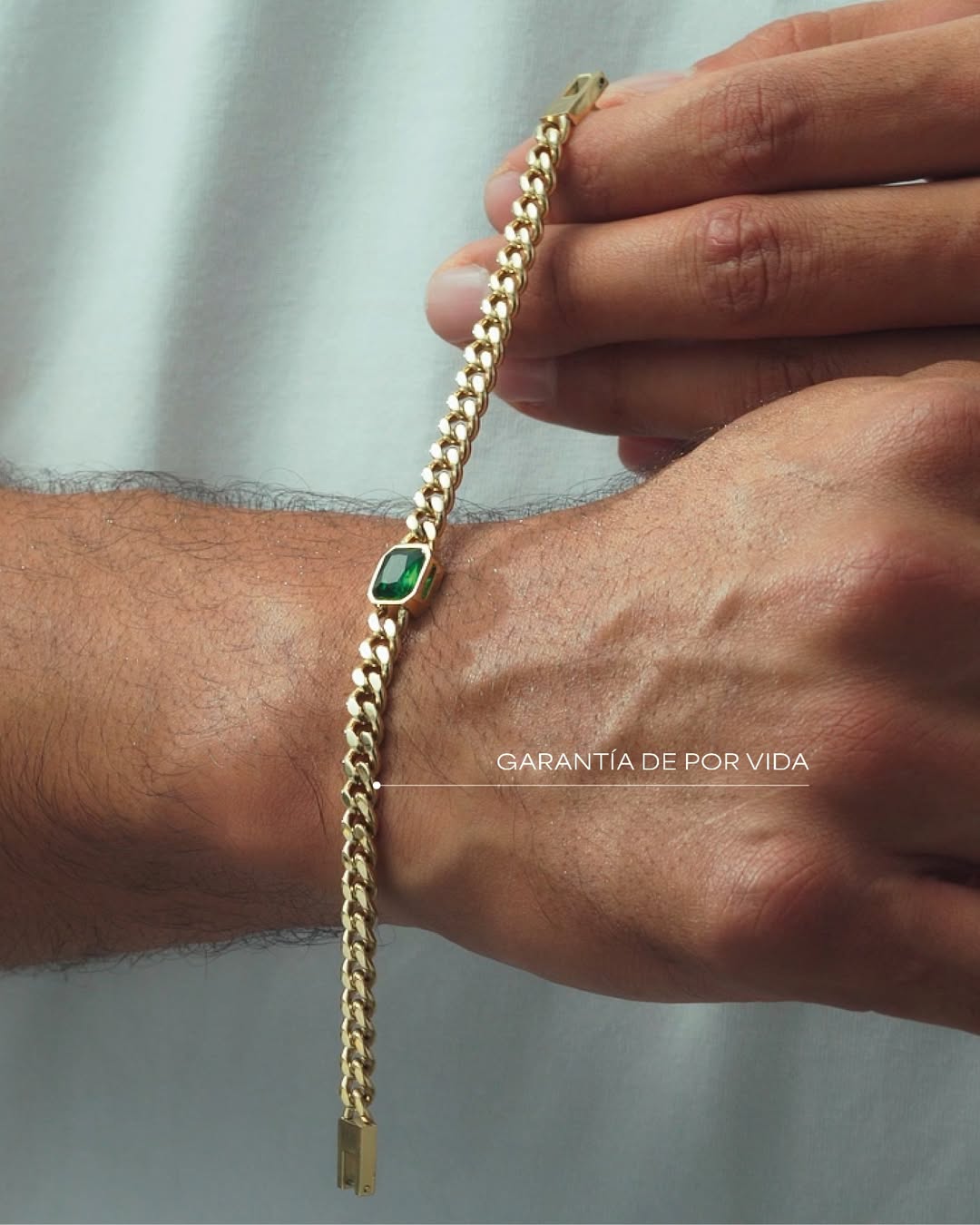 Pulso Élite Verde en oro laminado con piedra verde esmeralda ajustable símbolo de estatus fuerza y elegancia.