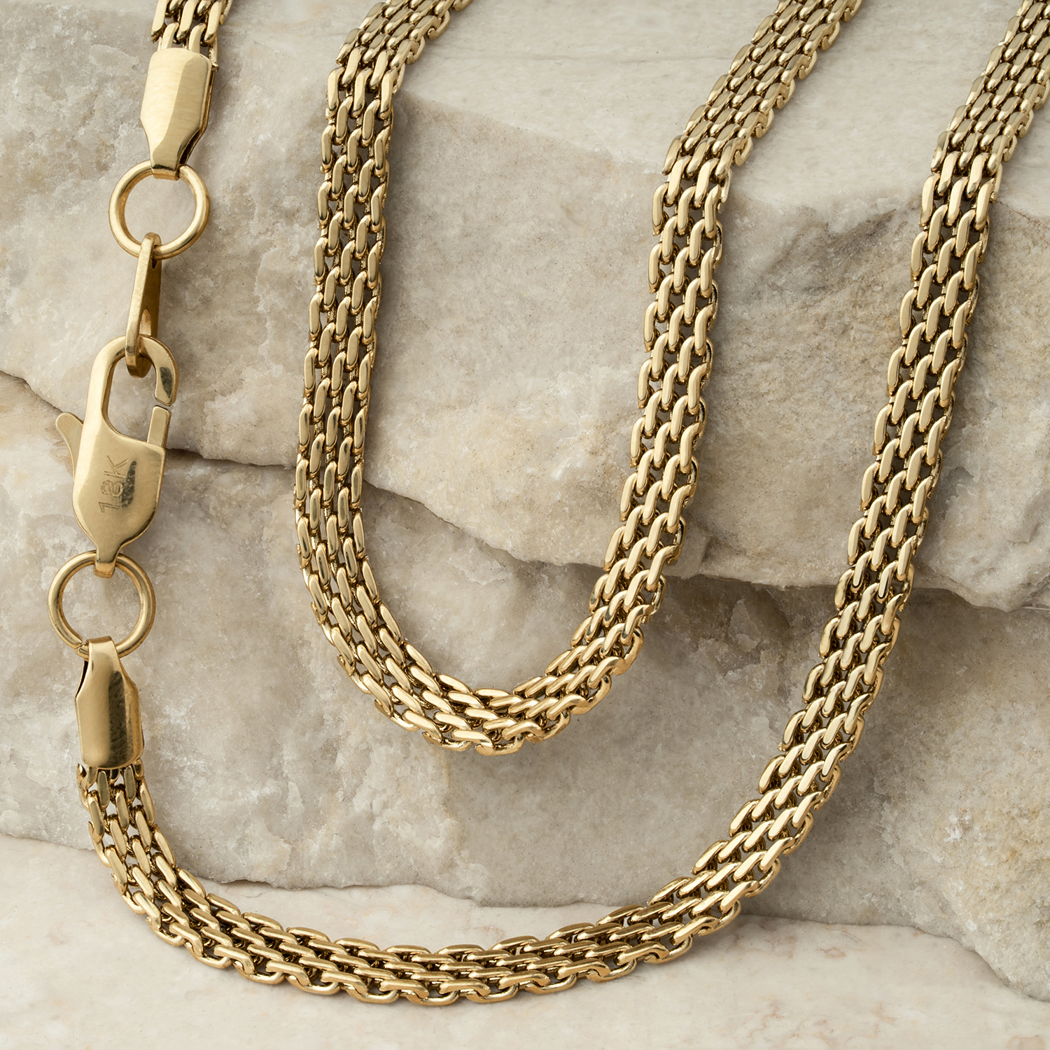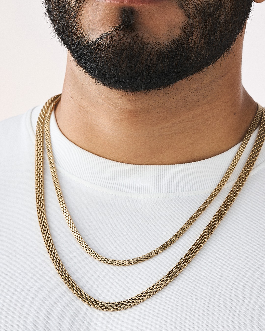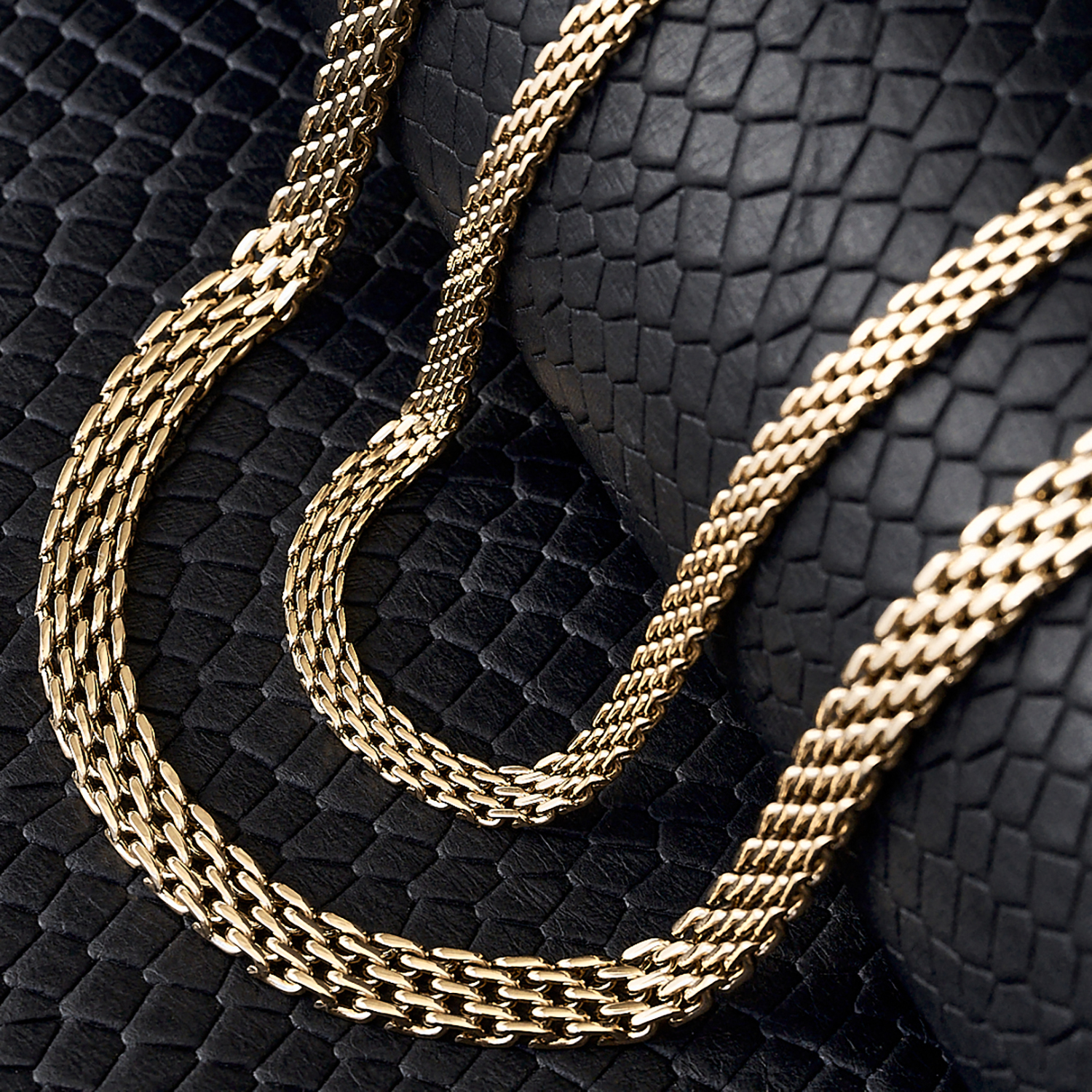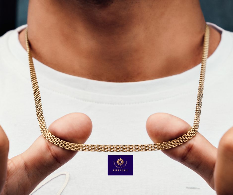 La Cadena Chinesca en Oro Laminado 18K destaca por su diseño fuerte y elegante, perfecto para quienes buscan un accesorio con carácter. Disponible en 65 cm de longitud y en dos grosores: 4 mm y 6 mm, esta cadena combina durabilidad con un brillo intenso y textura que imita el oro italiano.