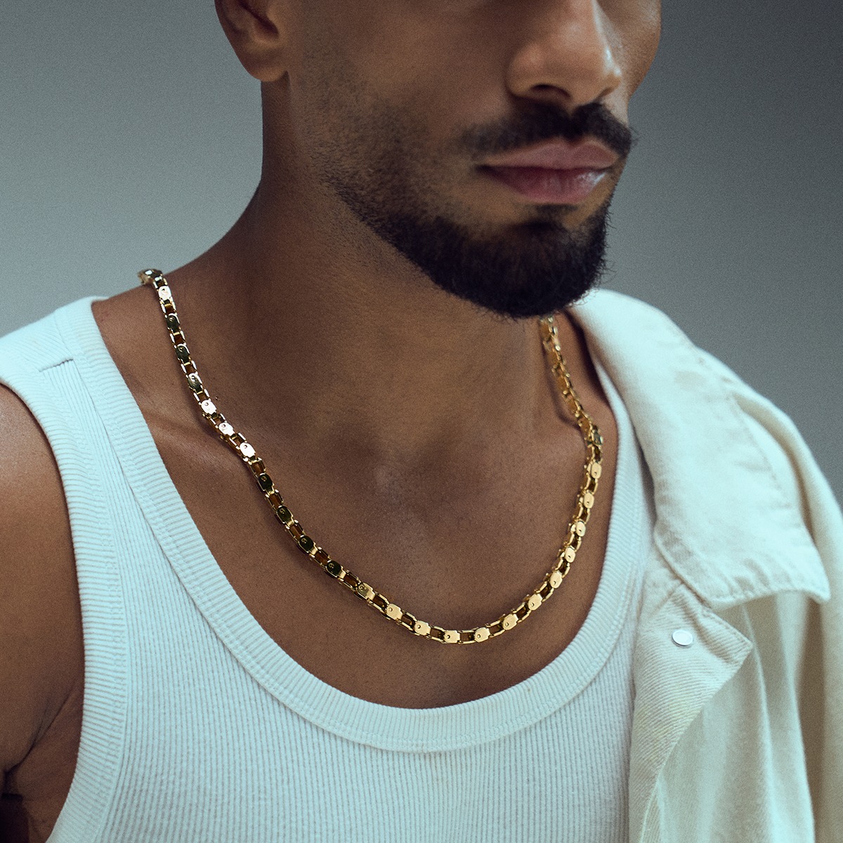 Cadena robusta en oro laminado 18K de 6 mm, con brillo italiano, diseño imponente, hipoalergénica y con garantía de por vida.
