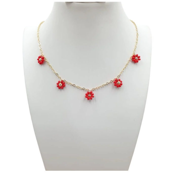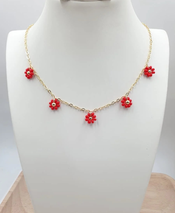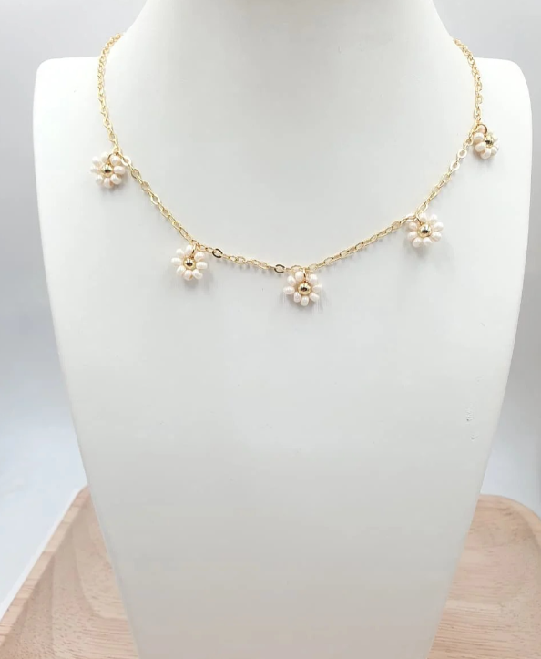 Diseño delicado con flores en chaquiras y baño en oro ideal para aportar un toque romántico y femenino a tu estilo.