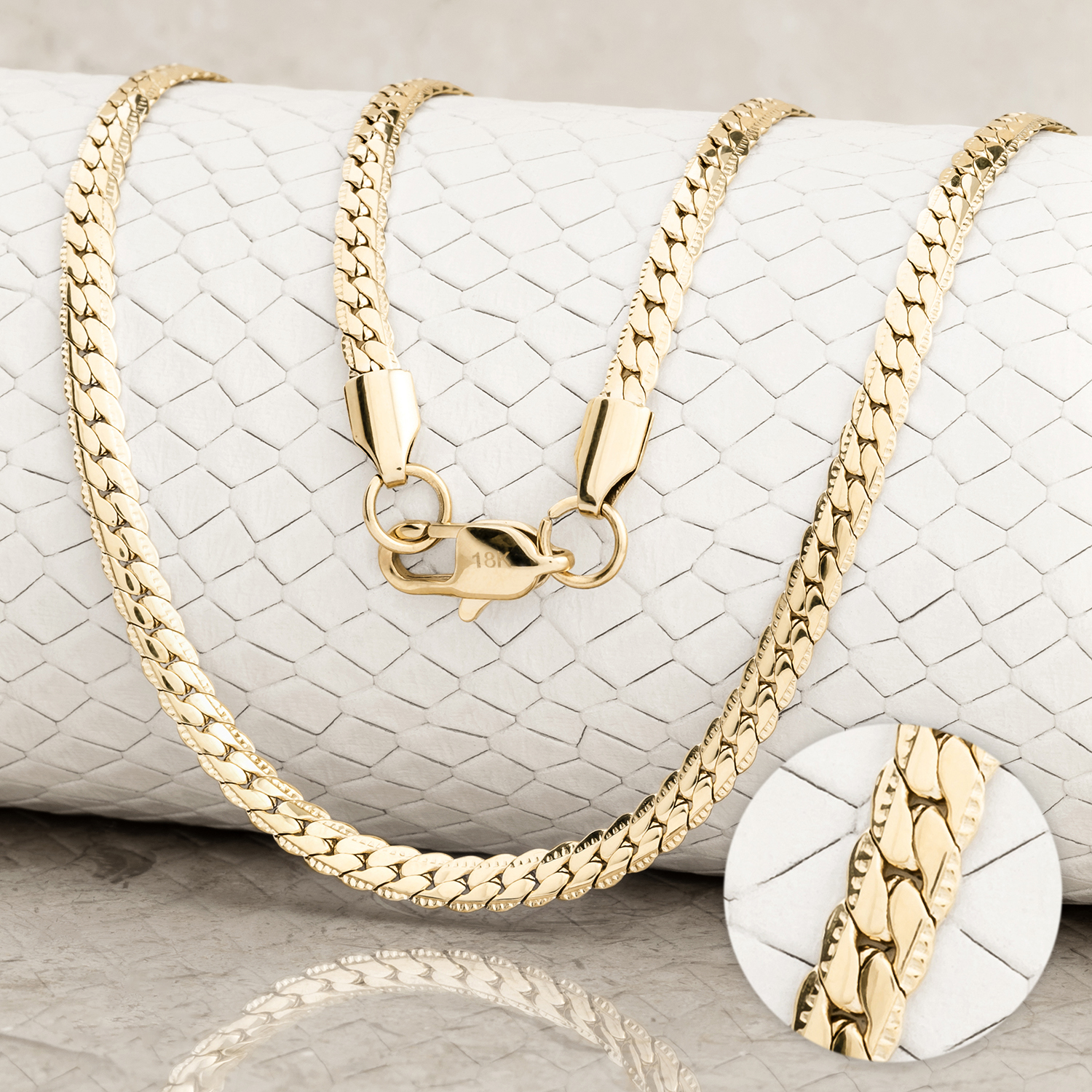 La Cadena Grabada en Oro Laminado 18K destaca por su diseño plano que se ajusta elegantemente al cuello, ofreciendo un brillo espejo gracias a su grabado en el borde.