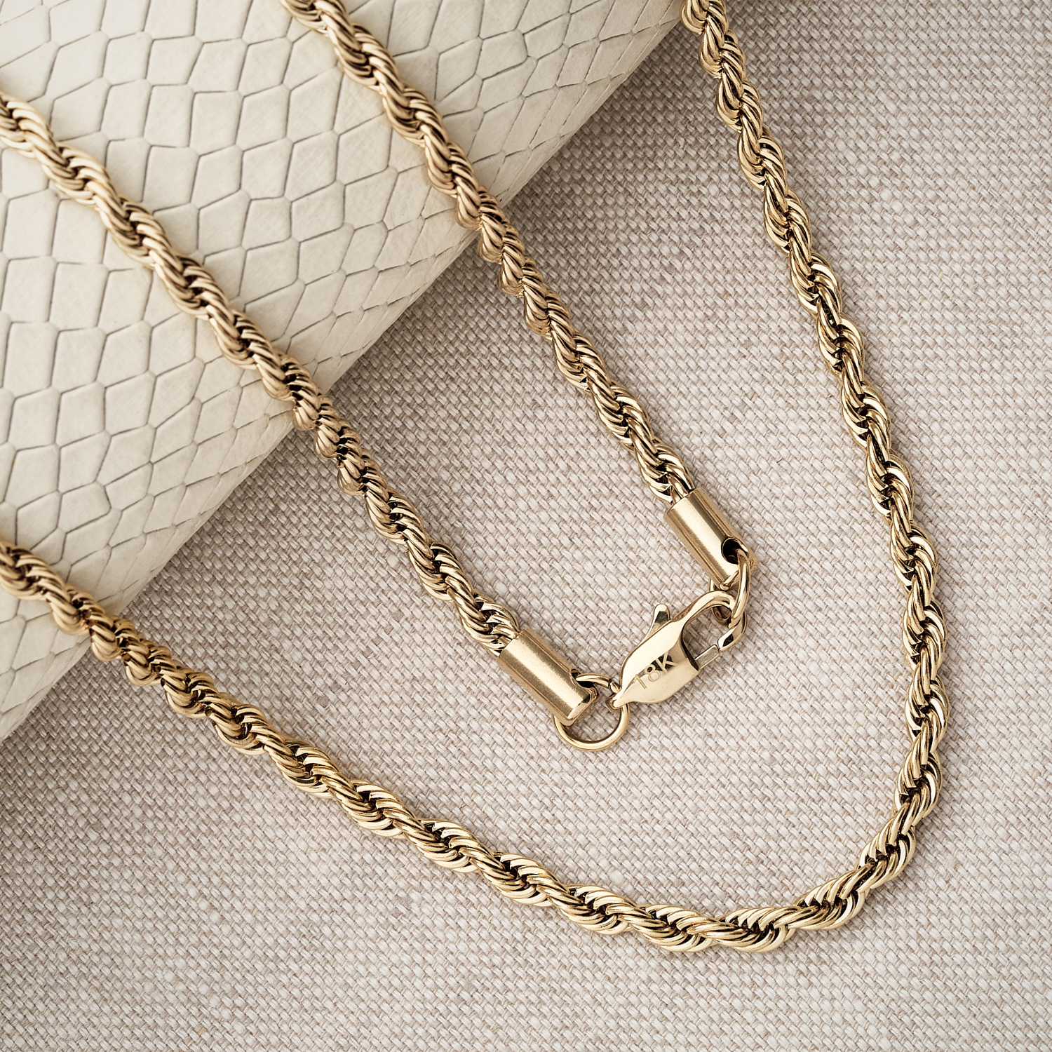 Cadena trenzada que no pierde su forma, con brillo intenso y diseño elegante ideal para uso diario y pieles sensibles.