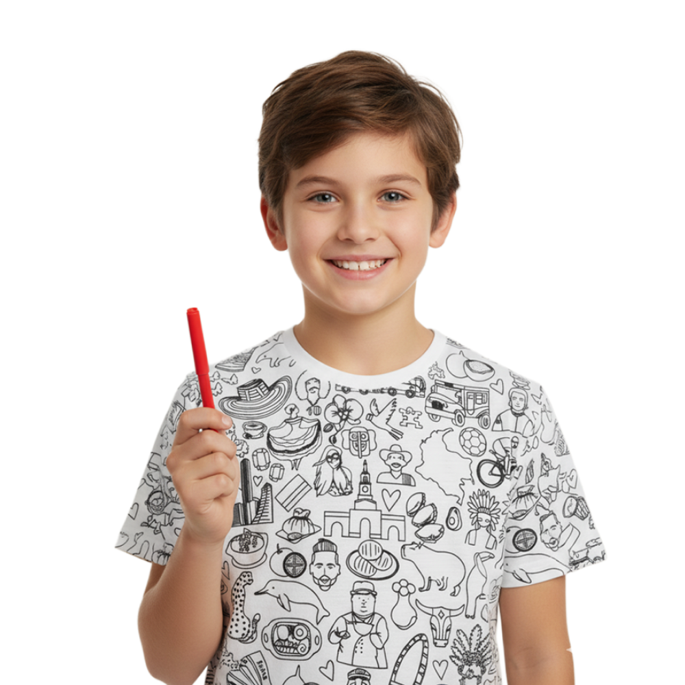 Camiseta estampada con ilustraciones de referencias a Colombia, juega a identificarlos y llenarlas de Color.