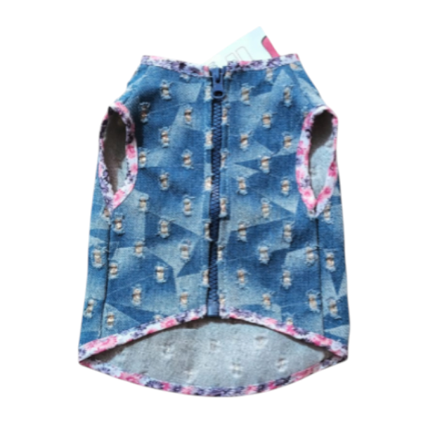 Chaleco en jean para mascota, con diseño urbano y ribete floral, ideal para días frescos o paseos con estilo.