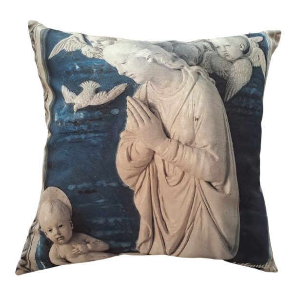 Cojín navideño con obra renacentista que irradia serenidad y devoción perfecto para un toque elegante en tu hogar.