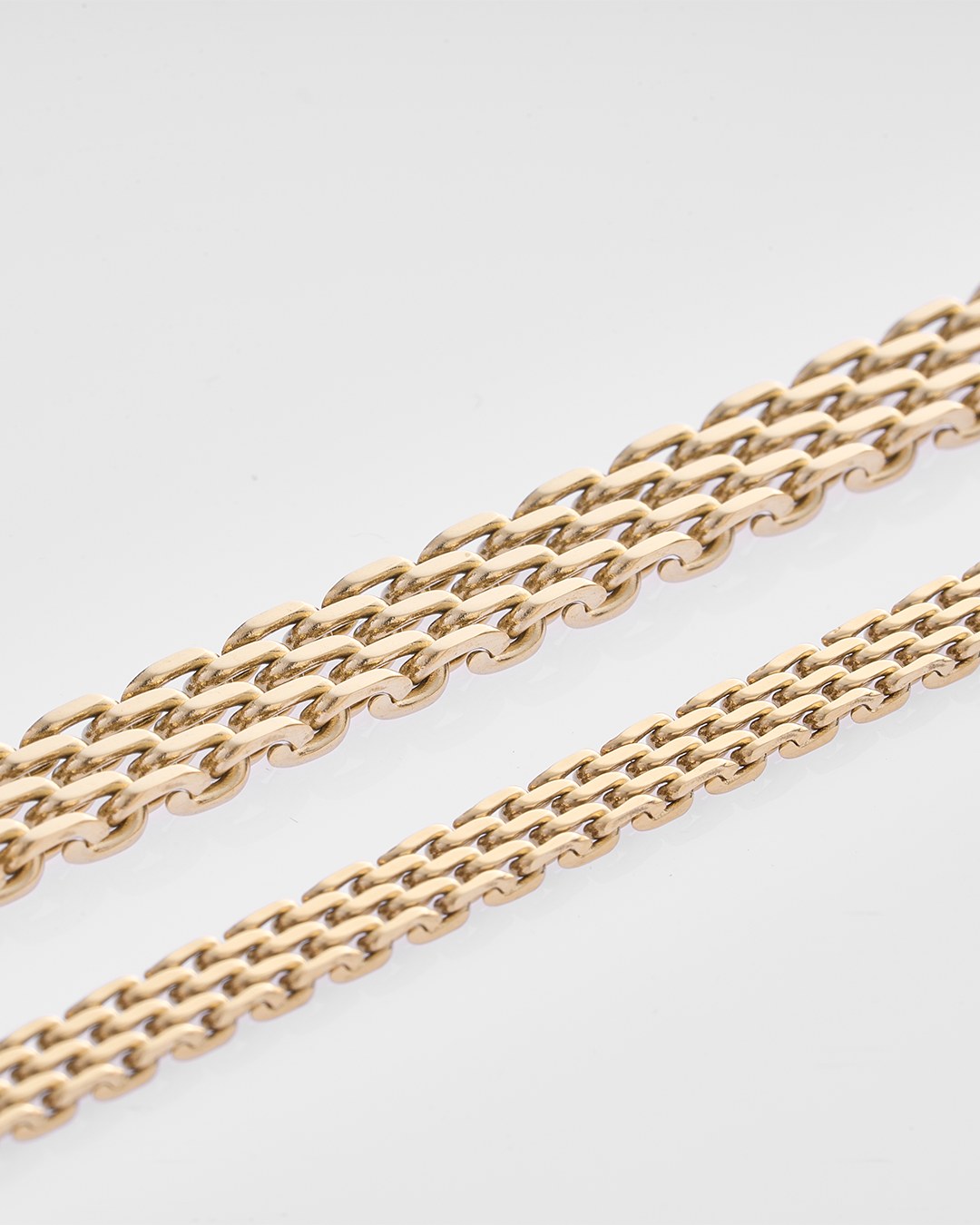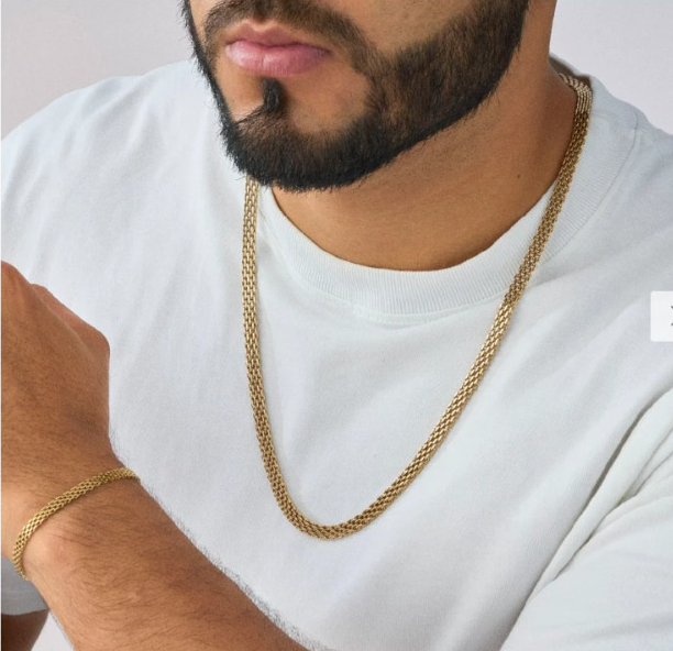El Combo Chinesco de cadena y pulso (4 mm) combina elegancia, fuerza y durabilidad. Fabricado con una base de titanio recubierta con Oro de 18 quilates, logra el color, brillo y textura del Oro Italiano, con una resistencia superior y un acabado de lujo.