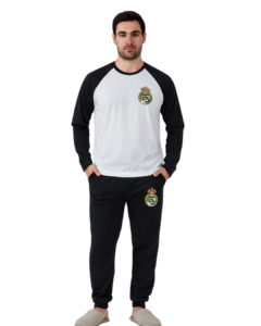 Este pijama de dos piezas es el conjunto perfecto para los fanáticos del fútbol que buscan comodidad sin perder estilo. Está compuesto por un pantalón y una camiseta de manga larga estilo raglán, ambos con el escudo del equipo estampado: el pantalón en la parte superior del muslo y la camiseta en el pecho.