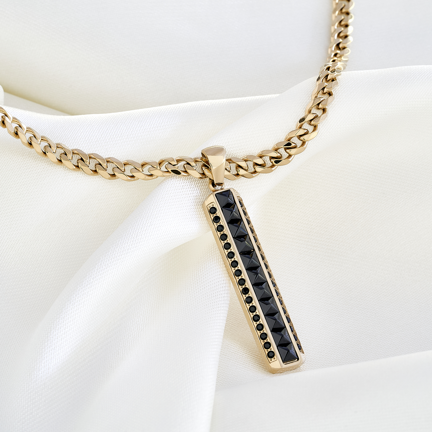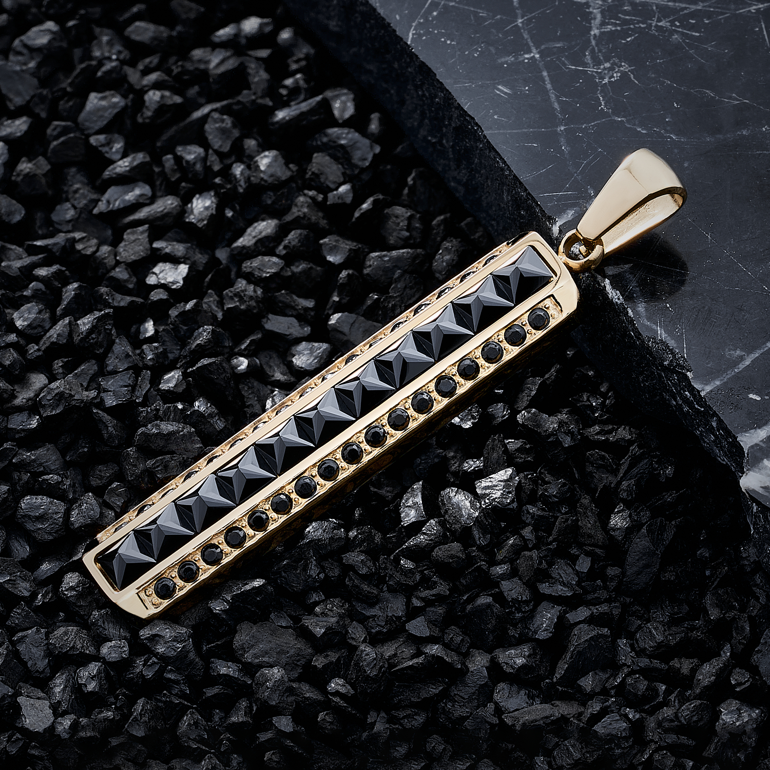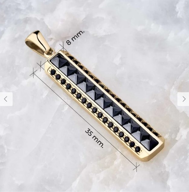 El Dije Barra Ónix es una pieza que combina la elegancia clásica con un diseño vanguardista y moderno. Su estructura geométrica en 3D resalta por las gemas negras en forma de pirámide, creando destellos únicos que capturan la atención y añaden carácter a cualquier look. Con un acabado en oro laminado premium, este dije presenta un brillo y textura idénticos al oro italiano, que garantizan una apariencia sofisticada y duradera.