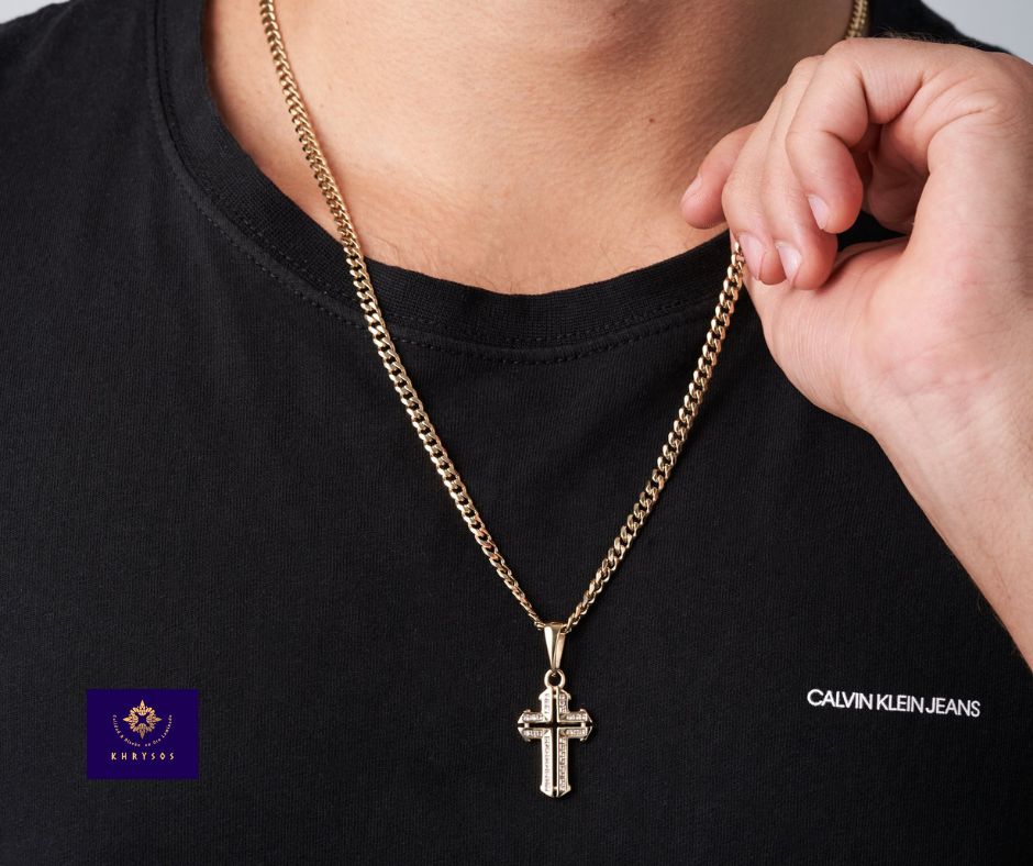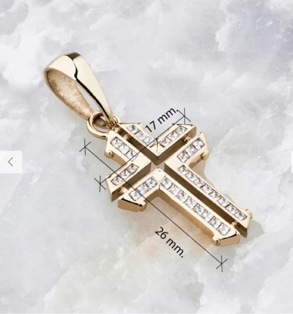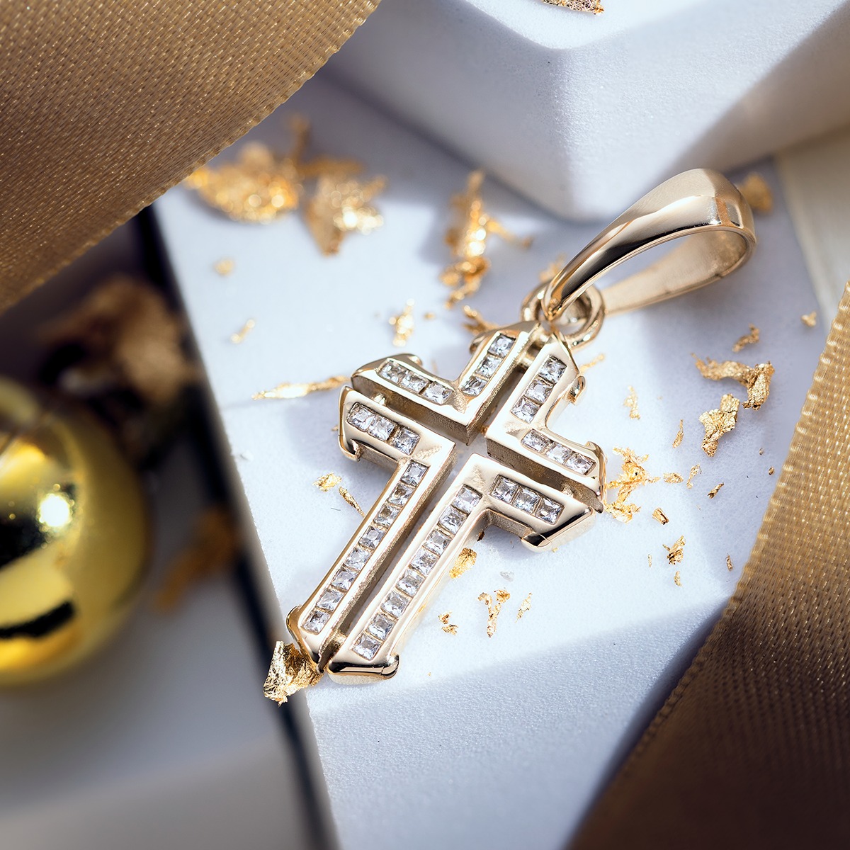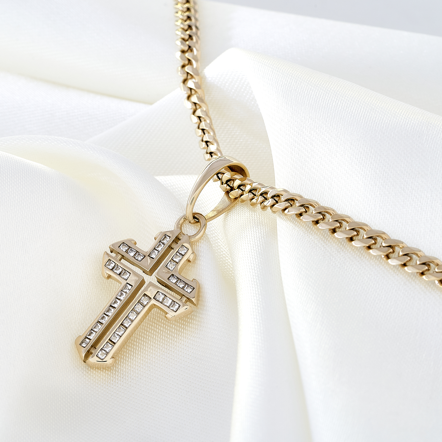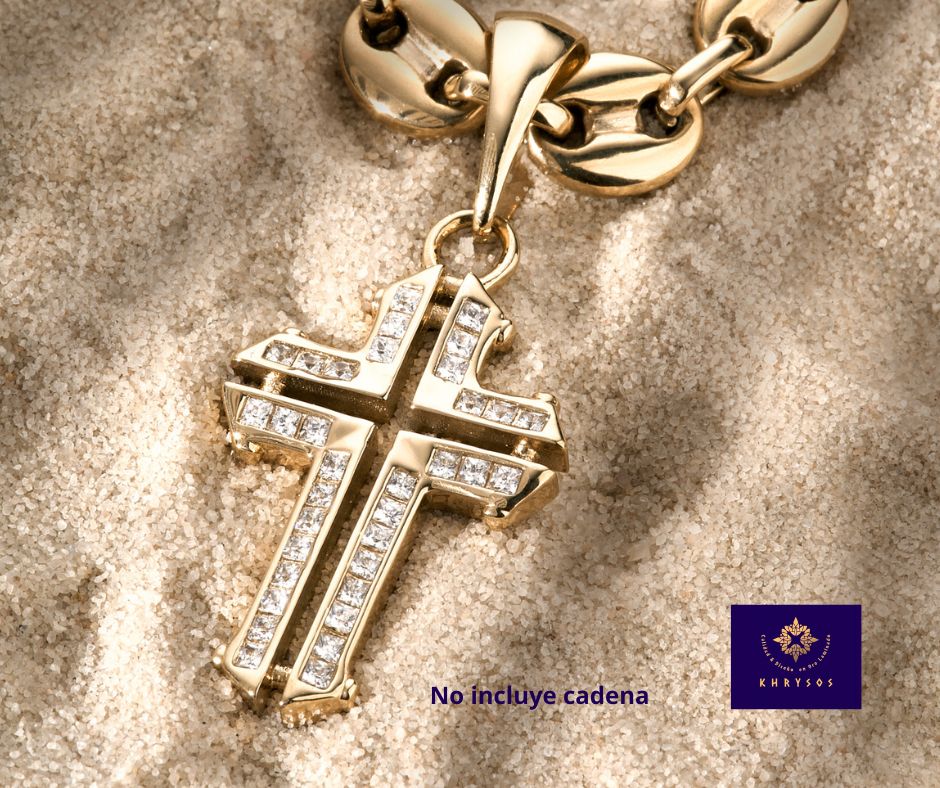 Dije de cruz elegante en oro laminado 18k con gemas blancas. Brillo, distinción y garantía de por vida contra cambio de color.
