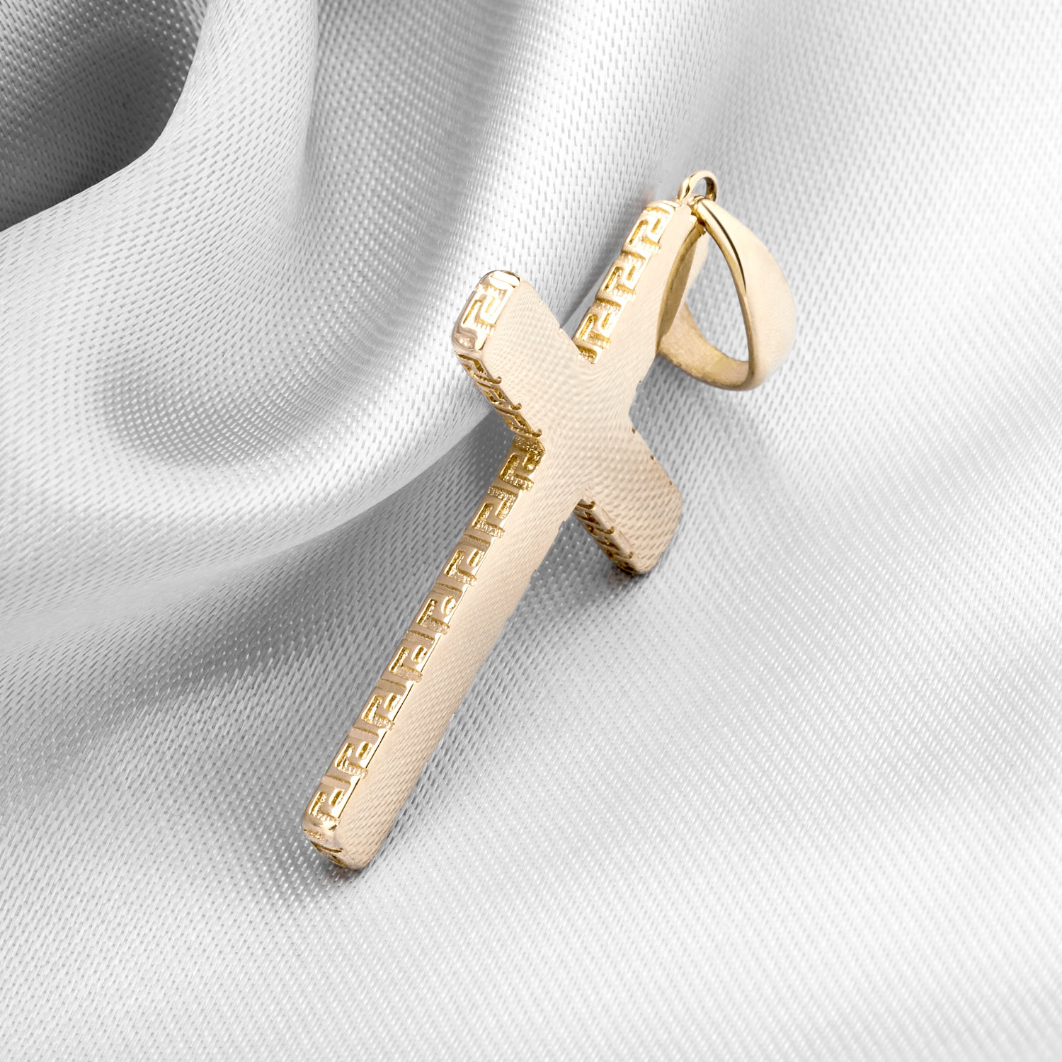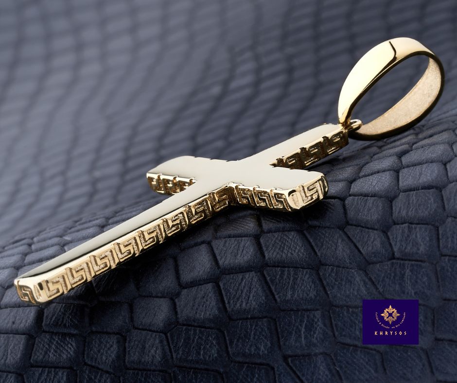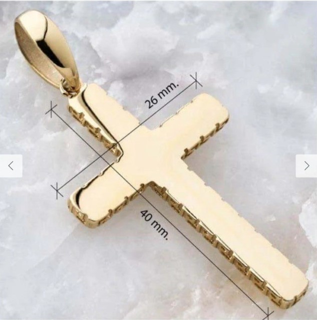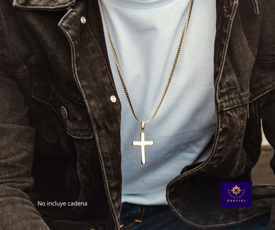 Sus grabados laterales únicos crean un patrón distintivo que enmarca la cruz, dándole un carácter artesanal y refinado. Con unas medidas ideales de 26 mm de ancho x 40 mm de largo, es una pieza con presencia, pero perfectamente equilibrada para el uso diario o eventos especiales.
