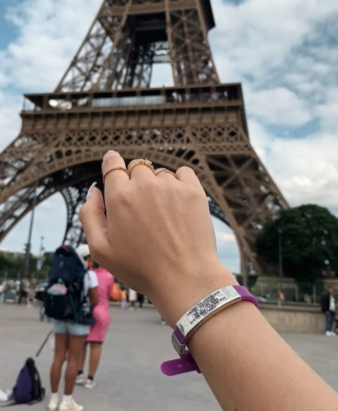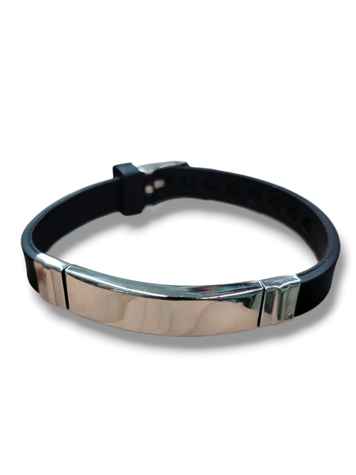 Brazalete delgado en neopreno con placa de acero grabada a láser y múltiples colores disponibles.