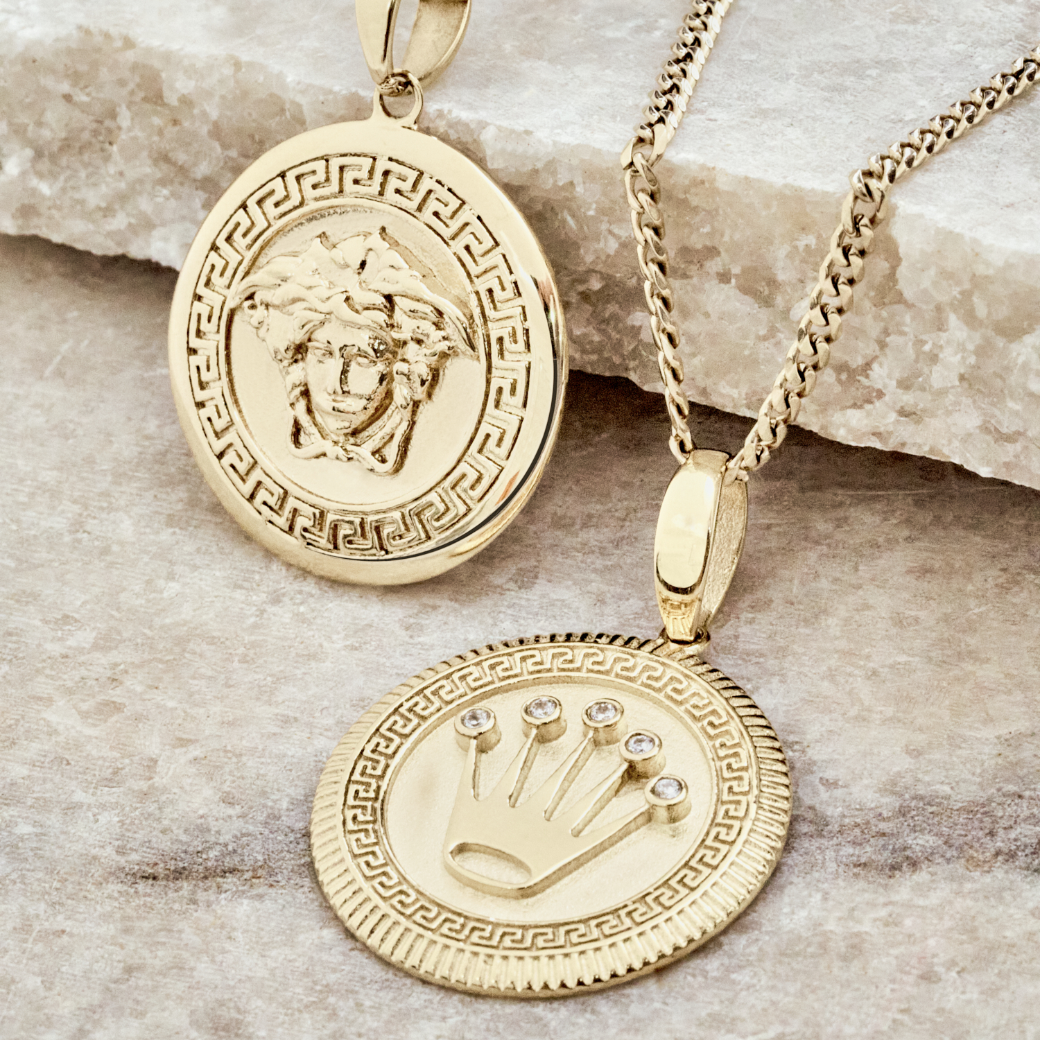Medalla dorada de Medusa en oro laminado 18k diseño imponente en alto relieve con garantía de por vida y estilo místico.
