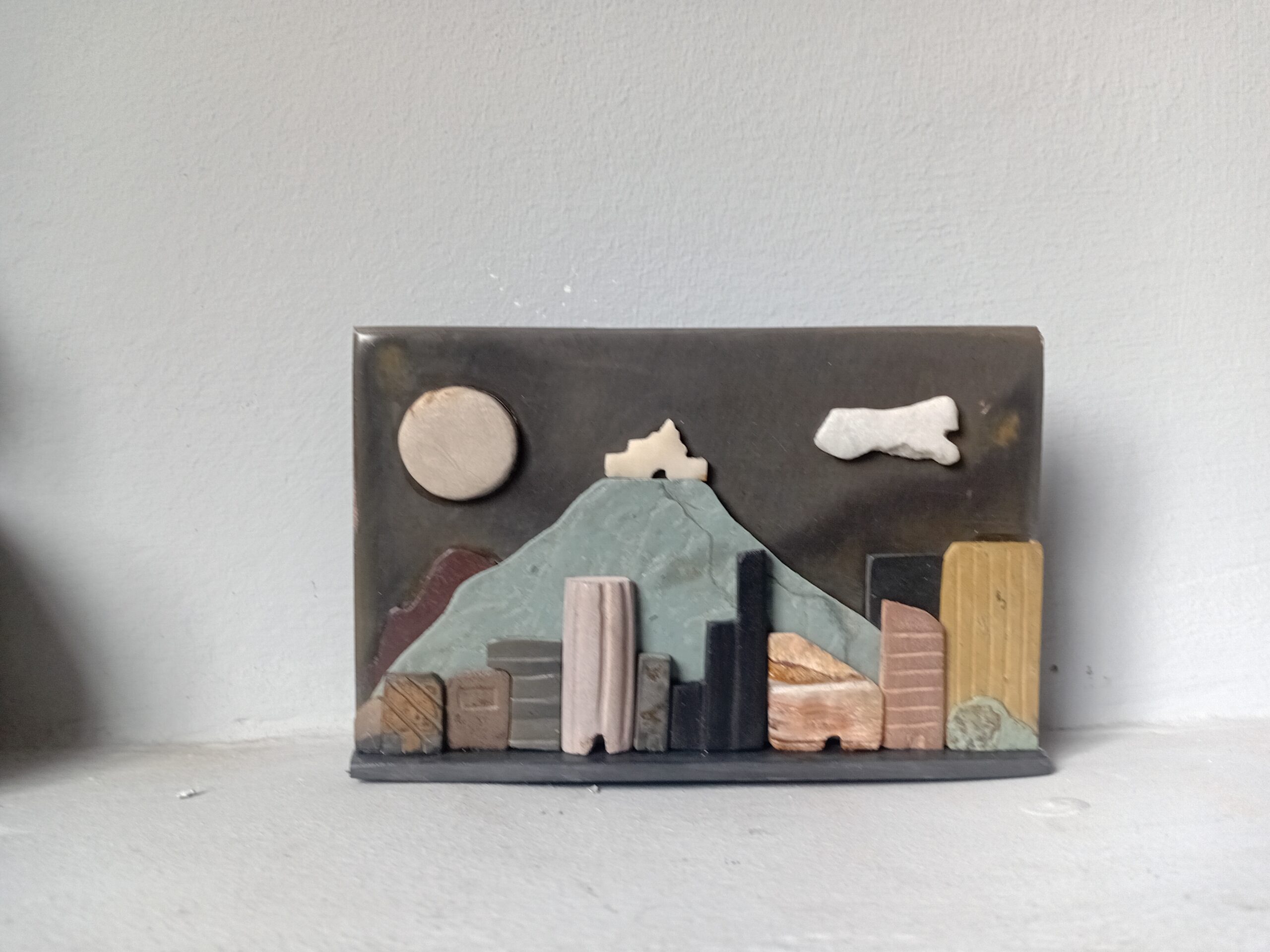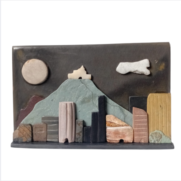 Souvenir artesanal en piedra laja y río con colores naturales que representa a Monserrate con diseño único y hecho a mano.