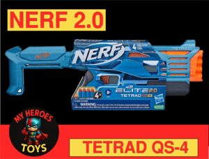 Bláster compacto de 4 disparos con acción de bombeo, potencia estable y dardos de espuma para juego seguro y continuo.
