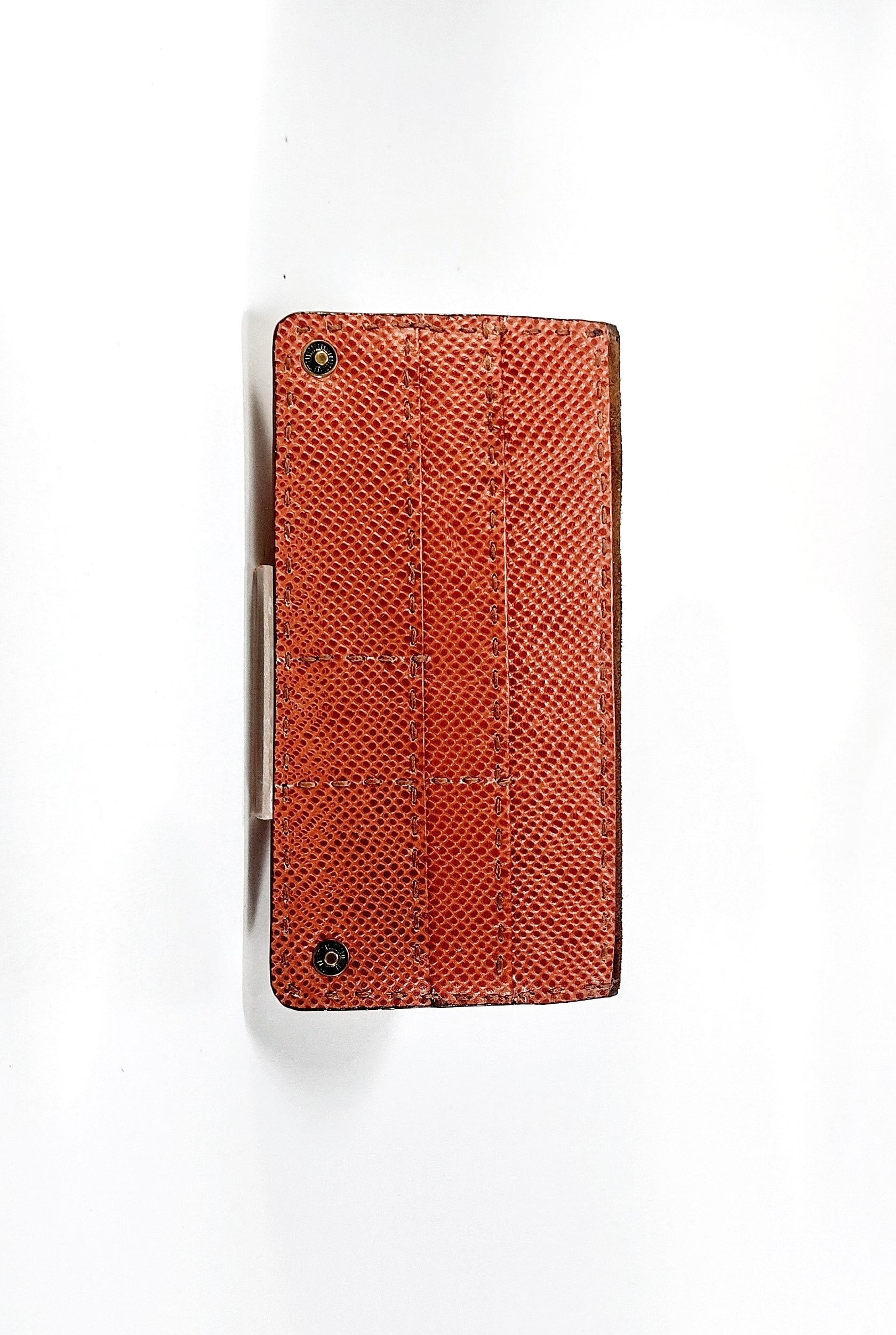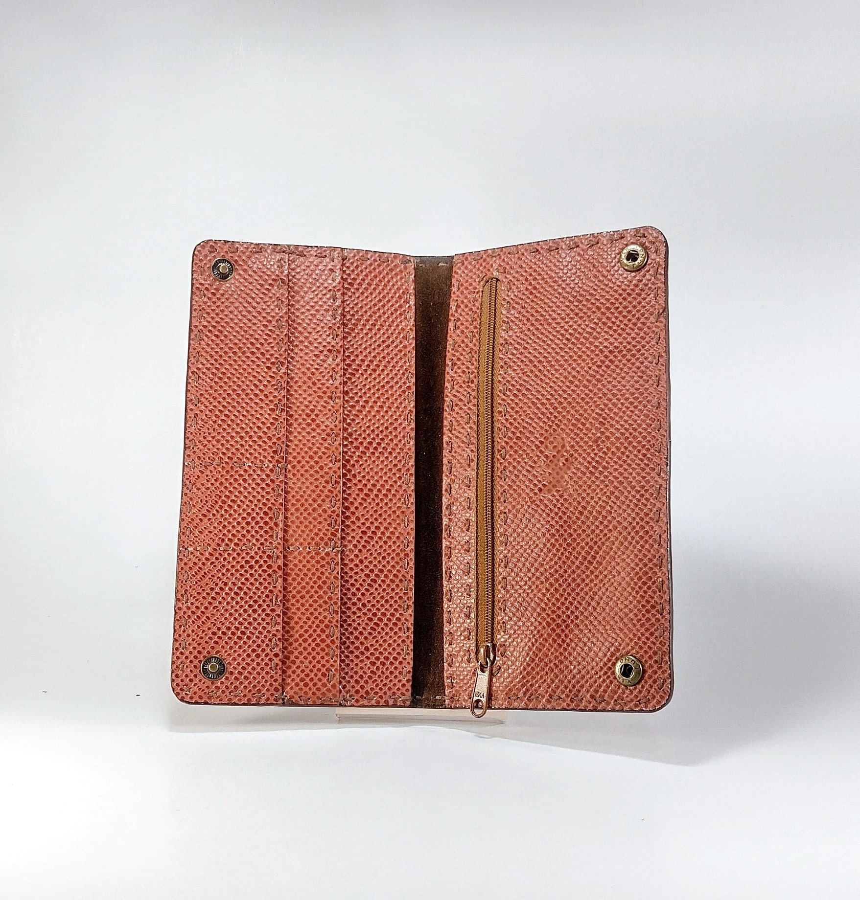 El diseño incluye un sistema de doble broche de cierre, que garantiza que el contenido se mantenga seguro incluso en movimiento. En el interior encontrarás cuatro ranuras para tarjetas que permiten organizar documentos tipo cédula, tarjetas de crédito o identificación. El forro interior está confeccionado en cuero de cabrito, aportando suavidad y resistencia al desgaste. La pieza está ensamblada con costuras hechas con hilo italiano, para un acabado refinado y duradero.