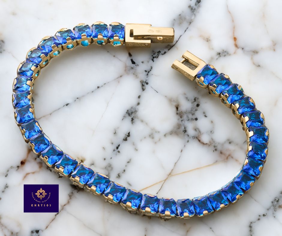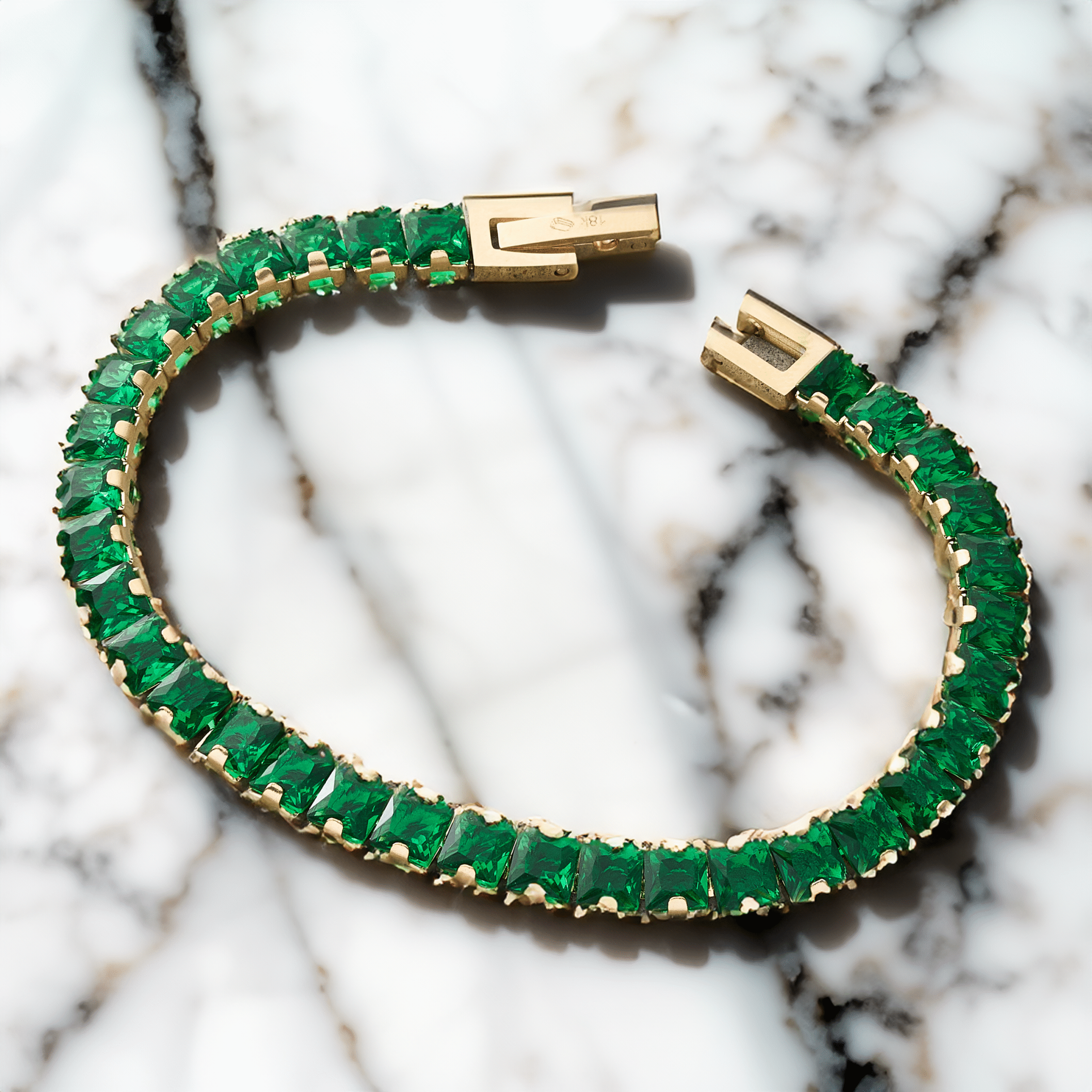 Pulso Tennis Cuadrado en oro laminado 18K. Brillo italiano y diseño unisex en tonos Verde, Azul y Negro.