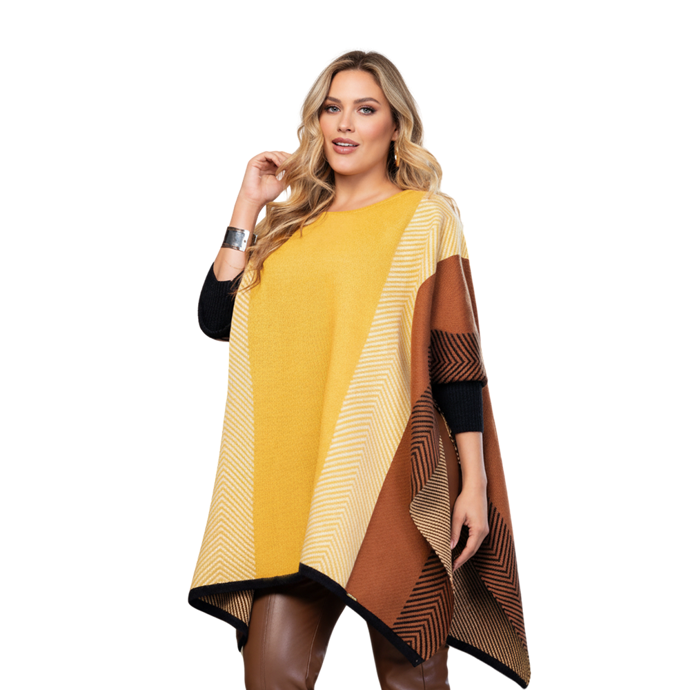 Ruana talla única artesanal asimétrica en tonos tierra y dorado. Aporta calidez y estilo único.