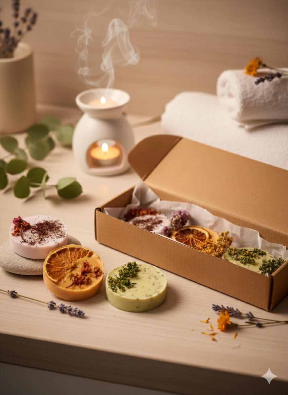 Set decorativo artesanal con inspiración botánica en presentación ecológica ideal como souvenir elegante y recuerdo especial.
