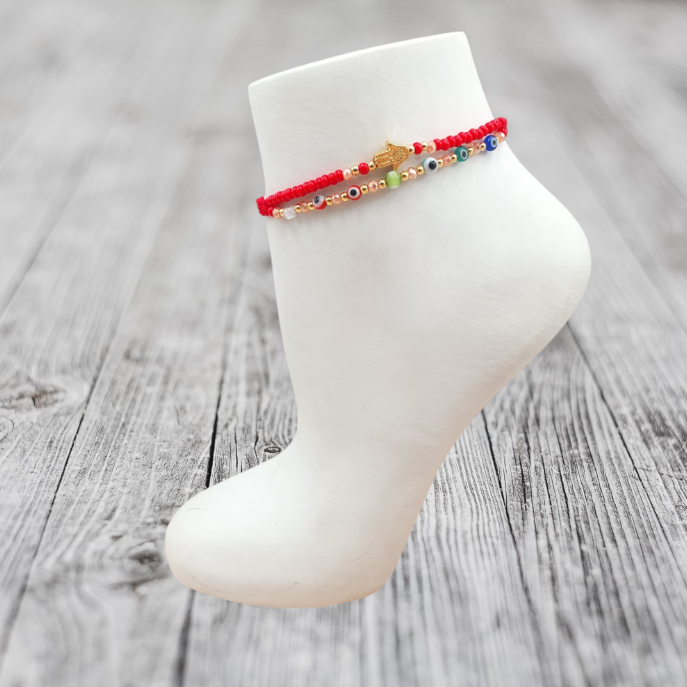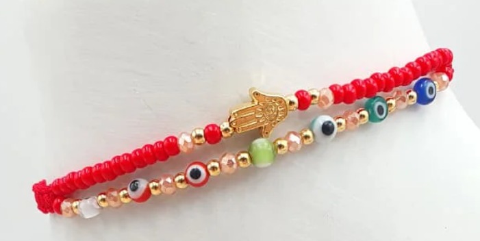 Diseño artesanal con chaquiras y ojos turcos ideal para complementar tu estilo diario con significado y protección.