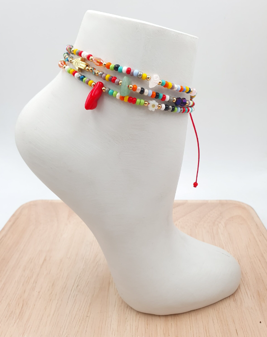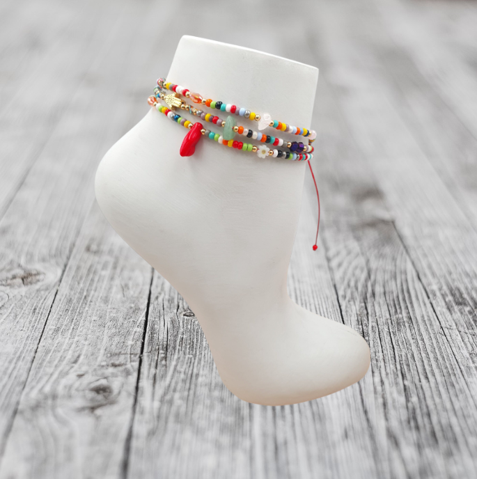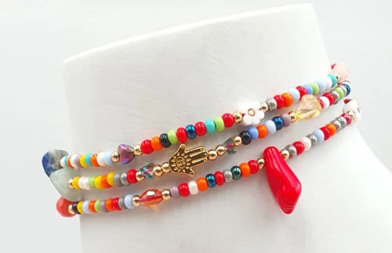 Diseño triple artesanal con chaquiras y dijes en rodio con baño en oro ideal para realzar tu estilo y simbolizar protección.