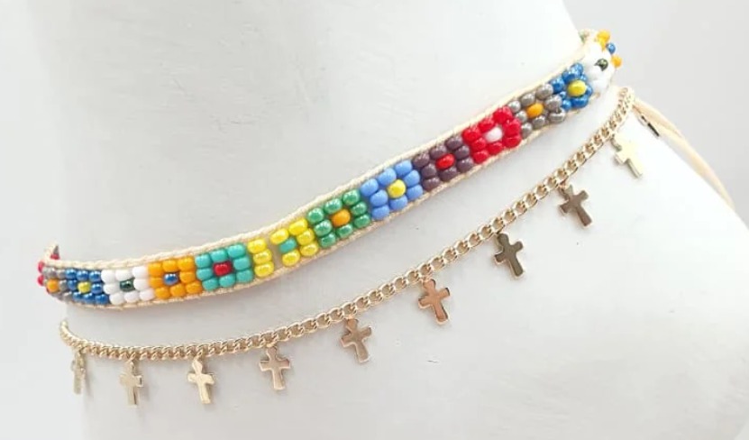 Diseño artesanal en macramé con chaquiras y dijes con baño en oro ideal para uso diario por su resistencia y estilo femenino.