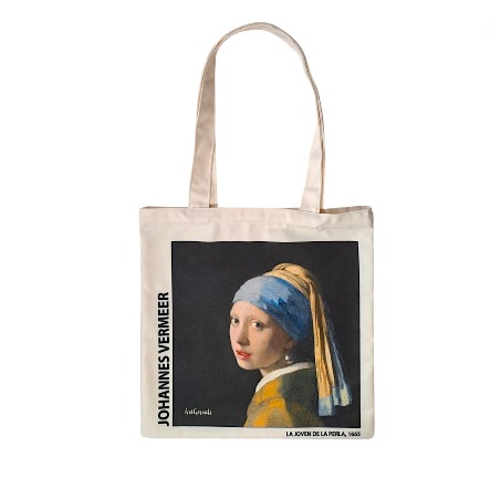 Tote bag elegante y resistente con arte clásico de Vermeer, tela poliéster antifluido y sublimación de alta calidad.
